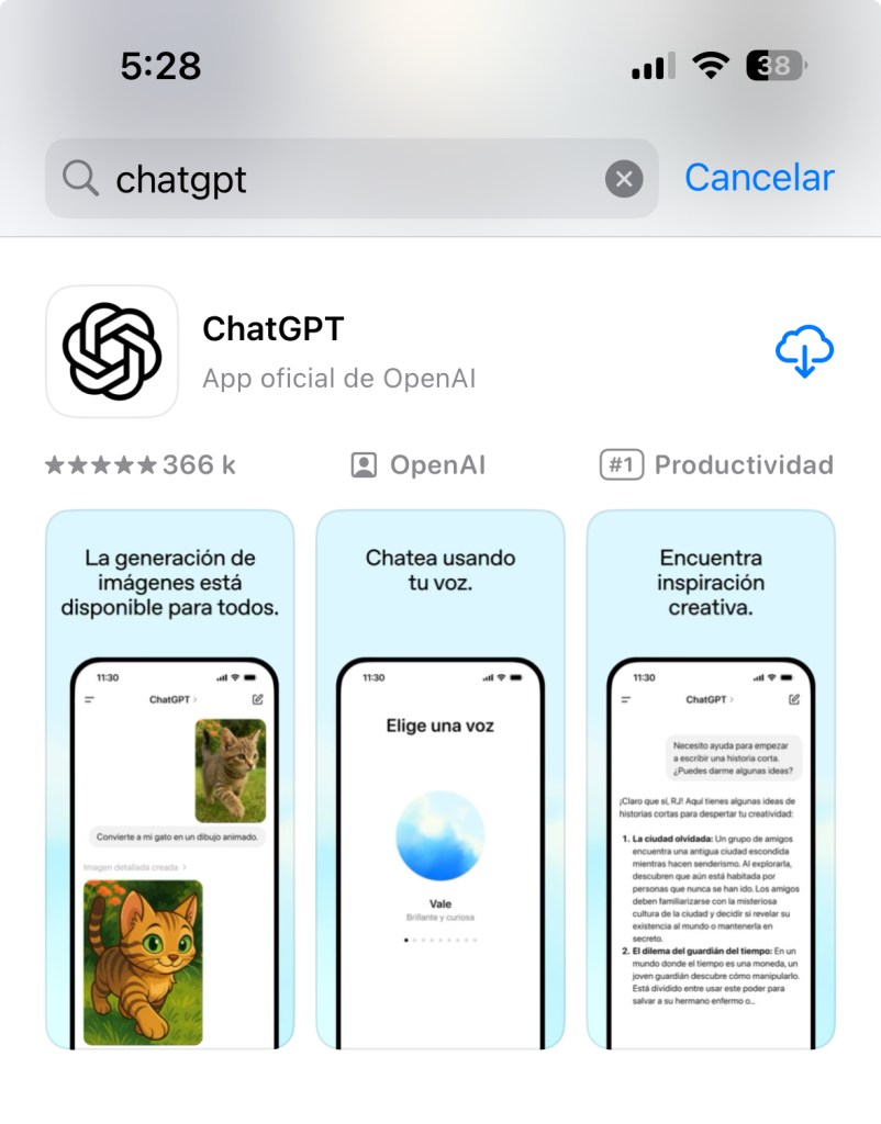 - Escribe «ChatGPT» en la barra de búsqueda y descárgala.